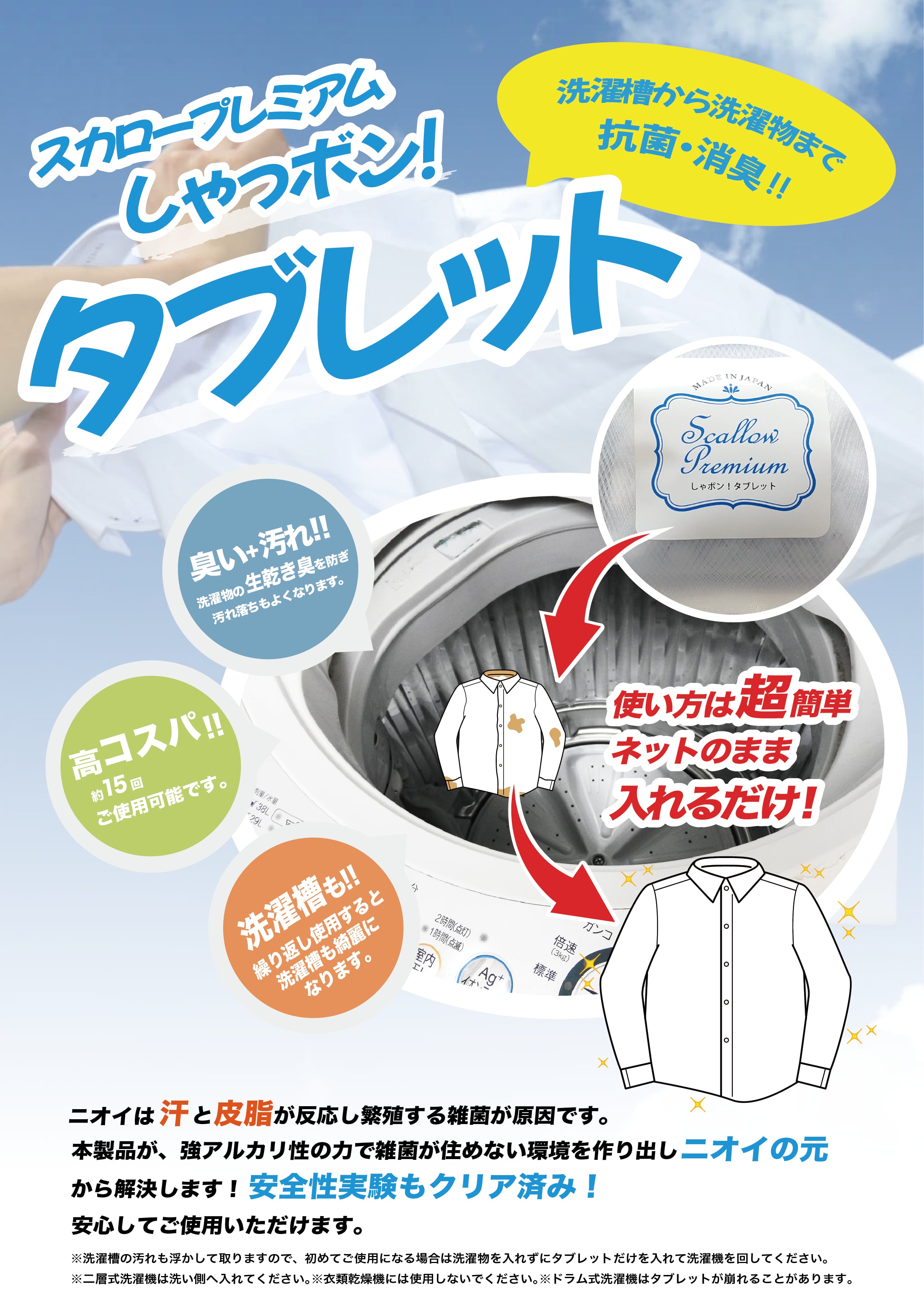 忘れがちな生乾き臭の悩みも、「しゃっボン!タブレット」にお任せ。毎日の洗濯がもっと快適になります!